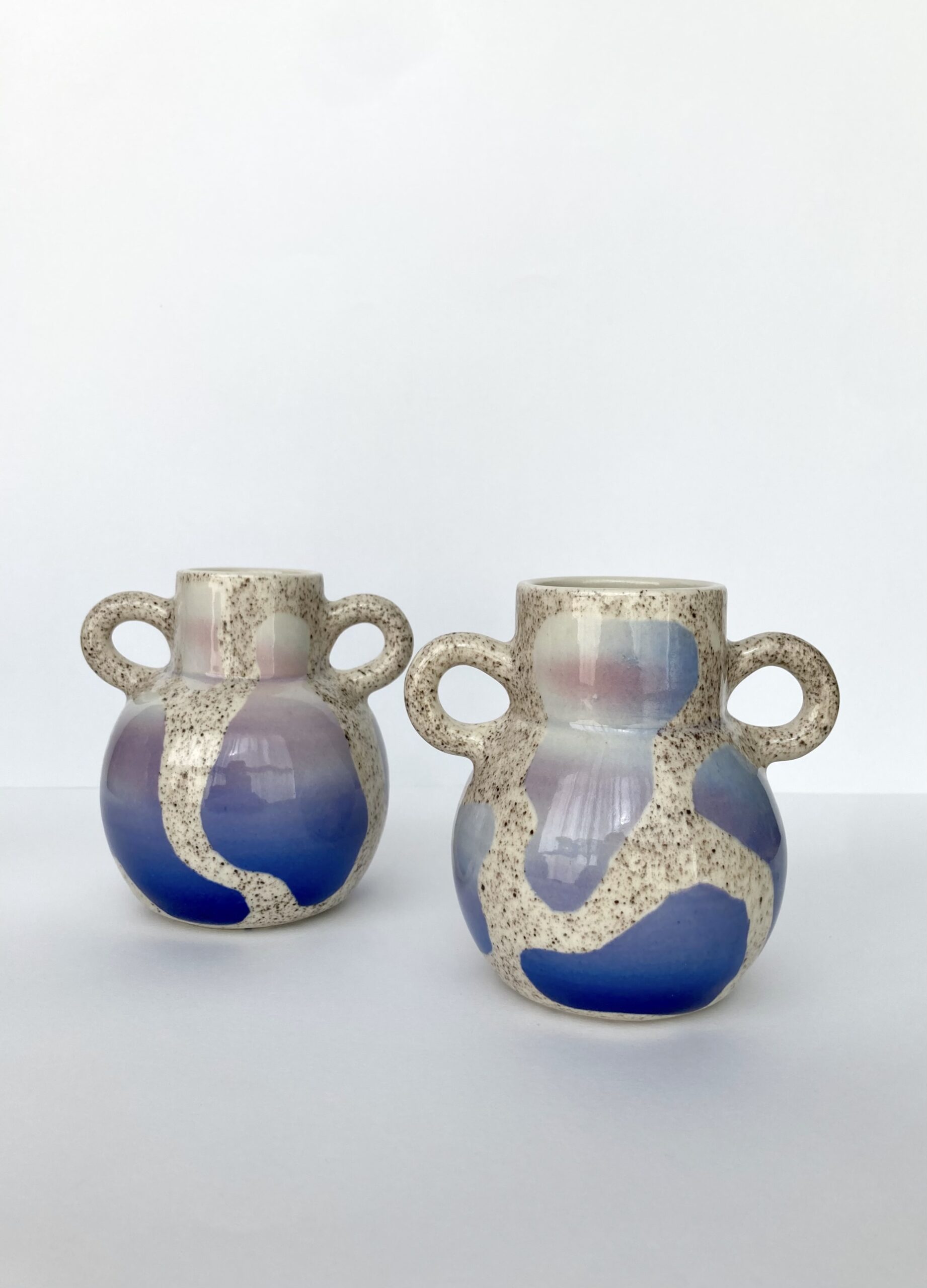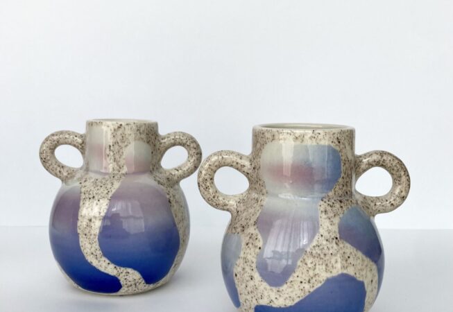 Grès utilitaires, tournage, motifs graphiques, dégradés et mouchetés
