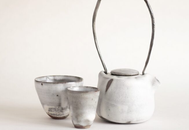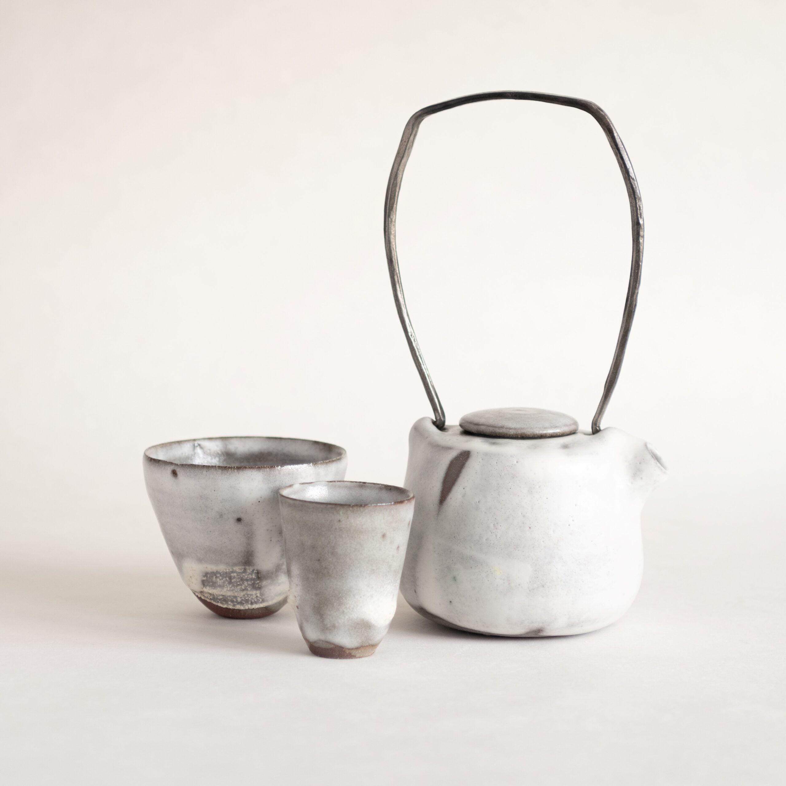 Grès et porcelaine, émaux kudo-mattos, sable glané, anses forgées