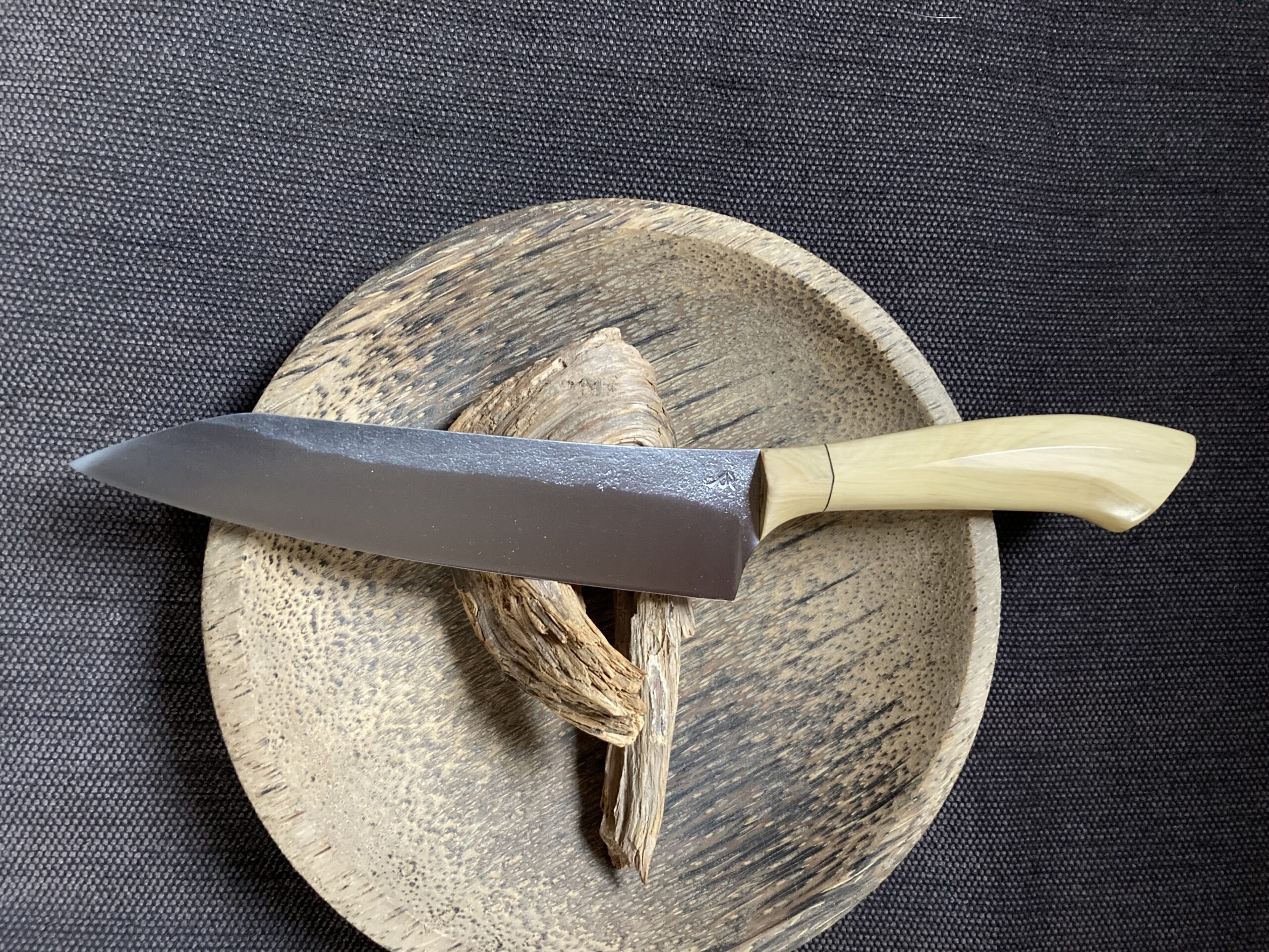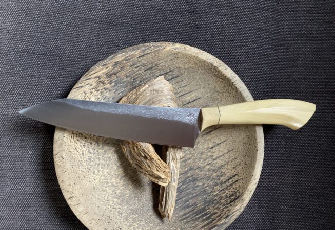 Quelque part en Bretagne, à côté de l’ancien Château des Gourvinec, au lieu dit du Bézit, j’ai le plaisir de faire revivre les outils de l’ancien forgeron du village. Il m’a raconté l’importance de son métier dans la vie de la commune: pour ferrer les chevaux, cercler les roues de charrettes, qui étaient encore très utilisées au début de sa carrière, forger et réparer les outils utilisés dans les champs, jusqu’aux dents de pelleteuses endommagées à la fin de sa vie professionnelle. Je m’attache à écrire la suite de cette longue histoire liant l’homme à ses outils, en proposant des couteaux uniques, entièrement artisanaux, forgés, à la fois fonctionnels et porteurs d’histoires. Vous trouverez dans les pages qui suivent quelques exemples de réalisations disponibles à la vente. Vous pourrez choisir votre bois et, en fonction des modèles, votre acier.