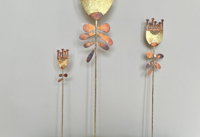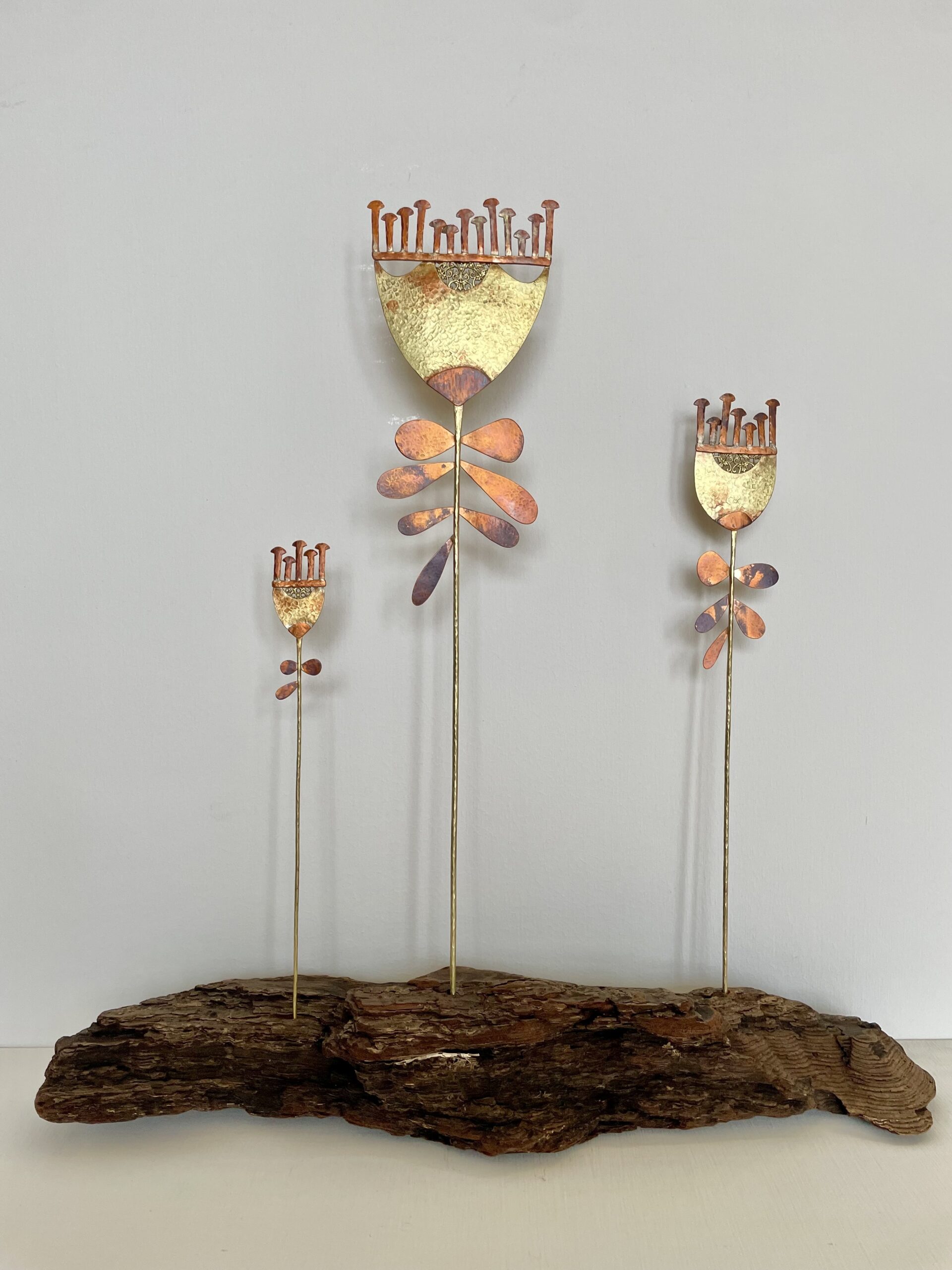 Le laiton et le cuivre comme matière première sous forme de tôles, de fils et d’objets détournés. Le tout découpé, forgé, martelé et brasé à l’argent.