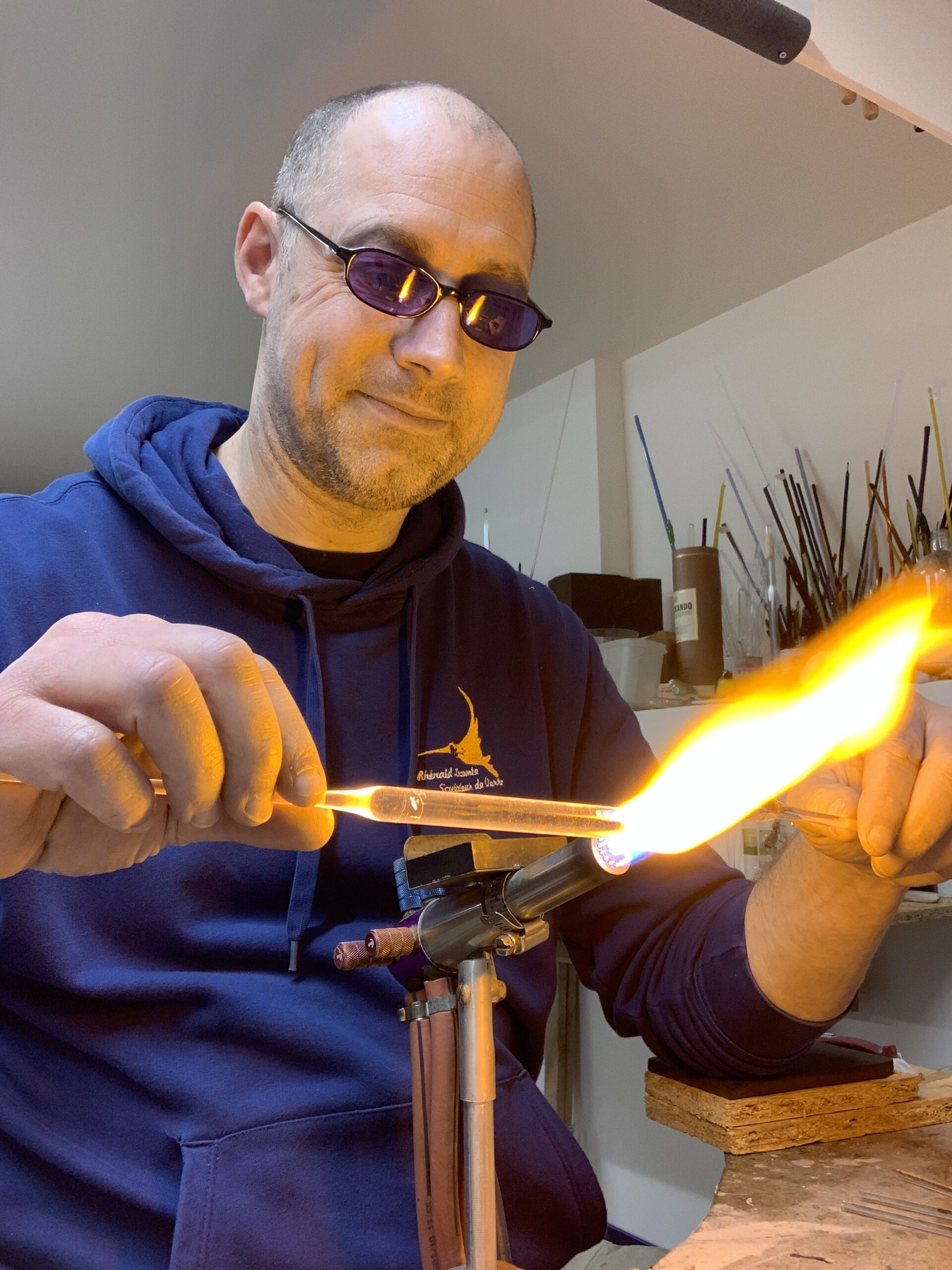 artisan verrier, est sculpteur de verre au chalumeau, installé à La Gacilly (56). Passionné par le travail de la matière et du feu, ses sculptures et créatures jaillissent en transparence et en lumière, grâce à un savoir faire transmis de père en fils. Passionné de nature, et profondément humaniste, l’univers de Rhénald Lecomte est peuplé d’oiseaux aux mille couleurs, d’insectes figés au plus près de la réalité, mais aussi d’hommages aux artistes qu’il affectionne. Venez assister à une démonstration de verre au chalumeau, où la flamme donne vie à des petits princes rêveurs, des voiliers de verre ou encore des montres singulières… Une ode au vivant et à l’imaginaire, portée dans un univers suspendu entre rêve et réalité !